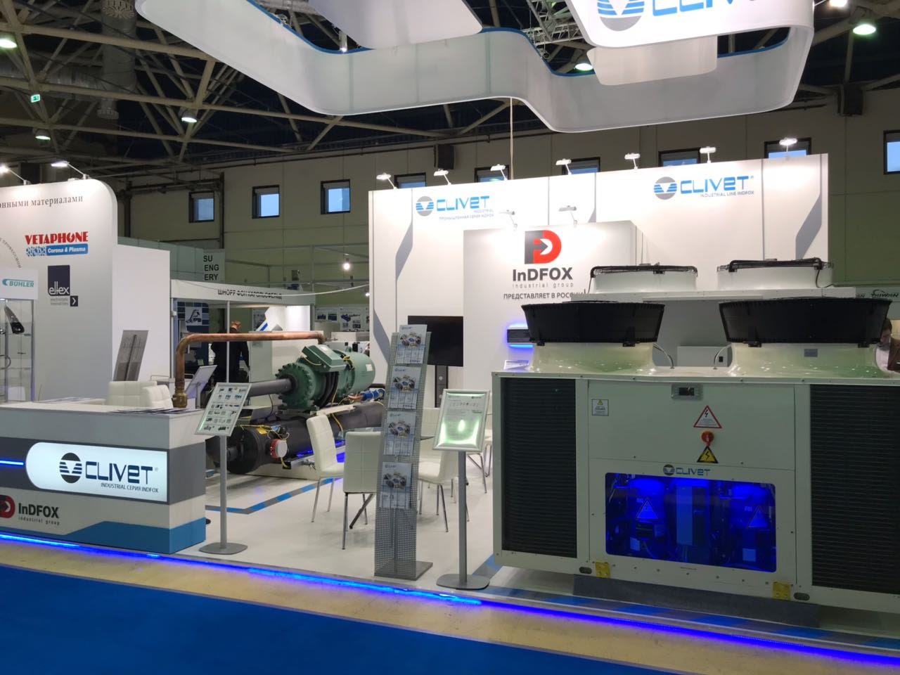 Официальный дистрибьютер итальянской компания Clivet в России, компания INDFOX представила на выставке чиллер с немецким винтовым компрессором и легко обслуживаемыми кожухотрубными теплообменниками WDH-SL3 200.1. Повышенная эффективность холодильного контура достигается за счет дополнительного